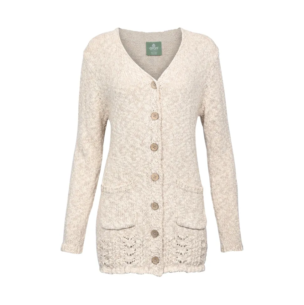 Cardigan long cot/linen van John Bardale is een fijn gebreid kledingstuk met een relaxed fit, ideaal voor ontspannen momenten. Gemaakt van een katoen-linnen mix, biedt deze cardigan comfort en duurzaamheid. De zandkleur voegt een natuurlijke tint toe, terwijl de lange V-hals en de houten knopen een rustieke touch geven. De zakken zijn zowel praktisch als stijlvol, en de subtiele breipatronen aan de onderkant geven een unieke uitstraling.