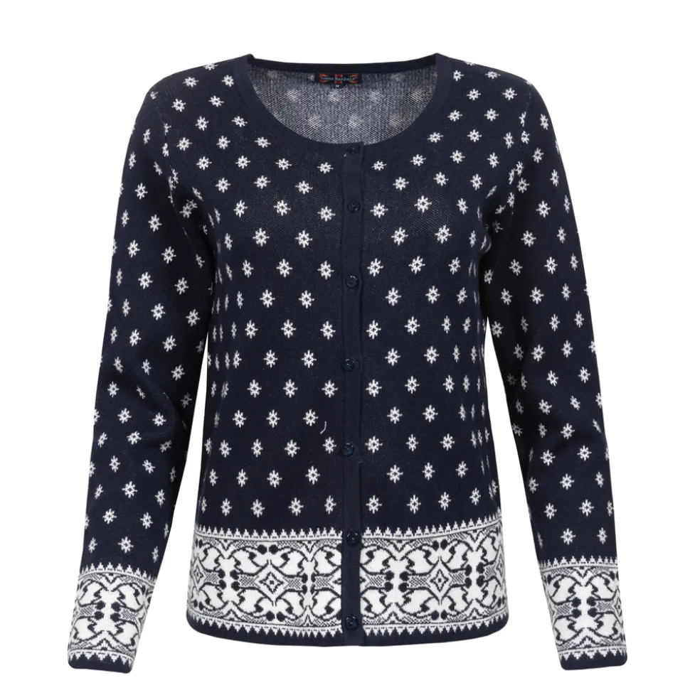 Cardigan winter biedt een relaxed fit die zowel comfort als stijl uitstraalt. Gemaakt van 100% katoen, is deze donkerblauwe cardigan perfect voor frisse dagen. De sneeuwvlokpatronen geven het kledingstuk een subtiele winterse flair. Met een knoopsluiting aan de voorkant en fijne boorden is het een veelzijdig kledingstuk.