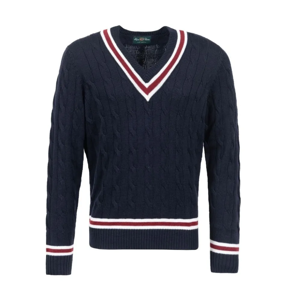 Pullover Cricket van Alan Paine is het perfecte kledingstuk voor frisse avonturen. Deze relaxed fit V-neck pullover in diep marineblauw is voorzien van een klassiek kabelpatroon. De stijlvolle rode en witte strepen bij de hals, boorden en zoom geven een sportieve twist. Gemaakt van 100% lambswool biedt het een heerlijk zachte en warme ervaring.