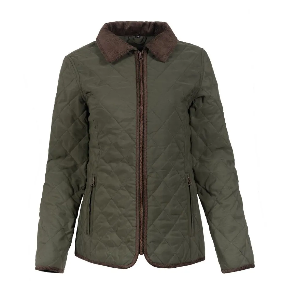 Quilted ladies jacket biedt een comfortabele en praktische oplossing voor het buitenleven. Met een relaxed fit en een klassiek doorgestikt patroon in een warme olijfgroene kleur, blijf je stijlvol en warm. De jas is voorzien van een zachte, bruine kraag en handige ritszakken voor je essentials.
