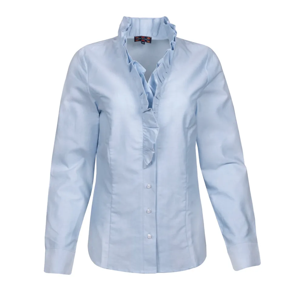 Ruffle blouse oxford met lange mouwen biedt een relaxed fit en straalt comfort uit in een zachte blauwe tint. Deze blouse van John Bardale is gemaakt van 100% katoen en heeft subtiele ruches langs de kraag en knoopsluiting. De stof voelt aangenaam aan op de huid en is perfect voor een casual uitstraling, terwijl de hoogwaardige afwerking zorgt voor een tijdloze look.