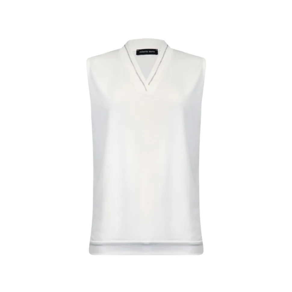Deze Singlet V-neck van Roberto Sarto biedt een ontspannen en comfortabele pasvorm met een elegante V-hals. Het witte kledingstuk combineert stijl met gemak en is gemaakt van een zachte blend van Modal en Elasthan, waardoor het licht en ademend is. De subtiele stiksels rond de V-hals geven een verfijnde touch. Perfect voor ontspannen dagen in de buitenlucht.