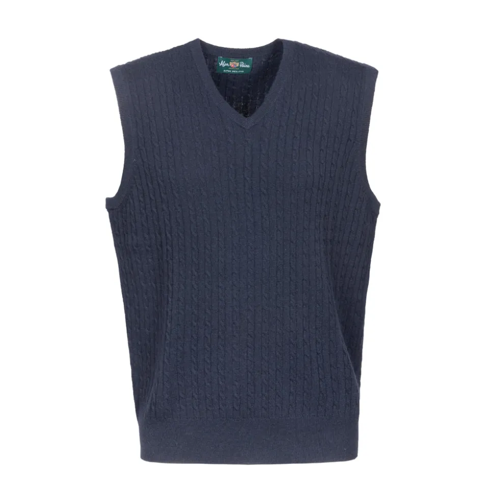 De Spencer Cable van Alan Paine biedt een stijlvolle combinatie van comfort en warmte. Met zijn diepblauwe kleur en kabelpatroon is deze spencer een tijdloze toevoeging aan je kledingkast. Gemaakt van 100% lambswool, biedt het kledingstuk een heerlijke zachtheid en een relaxed fit die perfect is voor een ontspannen dag buiten. De V-hals maakt het gemakkelijk te dragen over een overhemd.