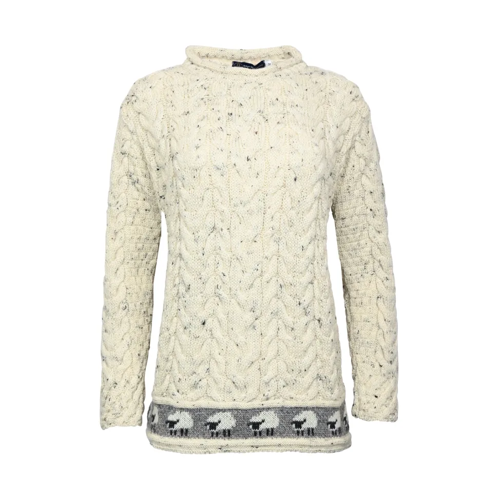 Sweater Sheep Border biedt een relaxed fit en is perfect voor een dag in de natuur. Gemaakt van warme, comfortabele wol en uitgevoerd in een lichte crèmekleur, houdt deze sweater je behaaglijk. Het kabelpatroon geeft een klassieke uitstraling, terwijl de grijze schapenrand net dat beetje extra toevoegt.