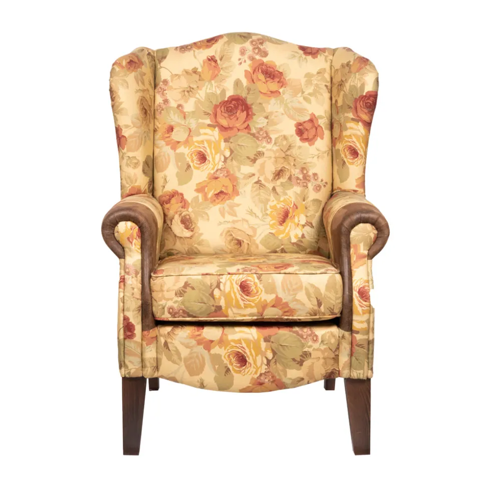 De Walmer Kozad Flower van John Bardale trekt meteen de aandacht met zijn levendige bloemenpatroon op een subtiele crèmekleur. Deze unieke stoel is bekleed met luxe Flower fabric en beschikt over manchetten van artificial leather Gobi, wat een warme uitstraling geeft.