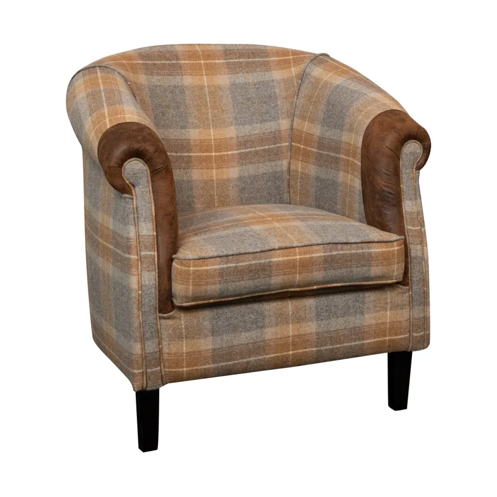 Breng comfort en stijl samen met de Lazy Moon U1104 FK van John Bardale. Deze prachtige stoel is bekleed met een klassiek geruit patroon in warme aarde- en grijstinten. De details met piping en de manchetten gemaakt van artificial leather Gobi in een rijke bruine kleur maken het geheel compleet. De stoel is comfortabel met een breedte van 73 cm, totale diepte van 75 cm, zitdiepte van 54 cm, hoogte van 82 cm en zithoogte van 44 cm. Kies uit een scala van stoffen, voor meer informatie kom je langs in de winkel.