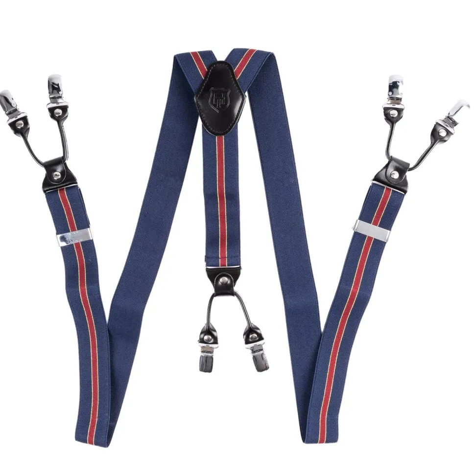 Navy/red stripe braces bieden een klassieke touch met een modern gevoel. Deze bretels hebben een opvallend navy en rode streep, ideaal voor wie waarde hecht aan subtiele details. Ze zijn stevig en comfortabel, perfect voor dagelijks gebruik, of je nu wandelt door het bos of geniet van een rustige dag buiten. De elastische constructie zorgt voor een flexibele, relaxed fit die niet inlevert op comfort.