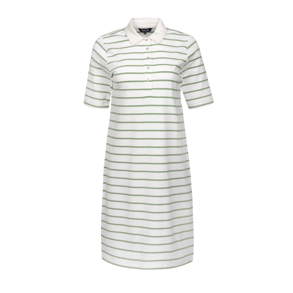 Ervaar ultiem comfort met dit relaxed fit model van Bloomings. Deze polo dress heeft een klassieke kraag en knoopsluiting, en is voorzien van een tijdloos streeppatroon in groen en wit. Gemaakt van 100% katoen, biedt deze jurk een ademend gevoel – ideaal voor ontspannen dagen.