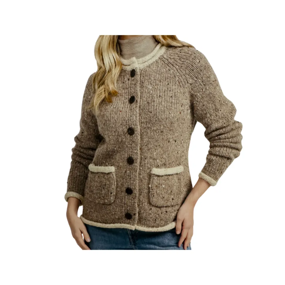 Deze cardigan met shawlkraag biedt een relaxed fit en is ontworpen voor comfort en warmte. Het Donegal-wol geeft een tijdloos, natuurlijk patroon in een warme bruintint, perfect voor frisse dagen. Met zorg afgewerkt met knoopsluiting en praktische zakken, straalt deze cardigan eenvoud en functie uit.