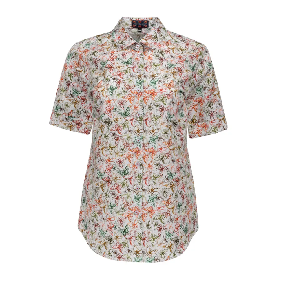 Shirt SS Butterfly: Ervaar het comfortabele gevoel van dit kleurrijke shirt in een relaxed fit. Het heeft korte mouwen en een levendig vlinderpatroon in diverse tinten op een lichte achtergrond. Vervaardigd van 100% katoen, biedt dit kledingstuk zowel ademend vermogen als zachtheid, ideaal voor warme dagen buiten. De klassieke kraag en subtiele knoopsluiting maken het compleet.